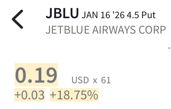 Based on the framework we laid out, we initiated put option exposure in JetBlue, specifically the Jan 16, 2026 $4.50 put.